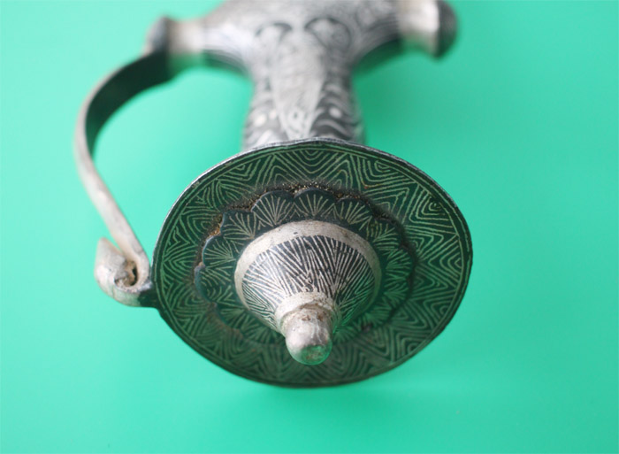 友情提示:67cm叙利亚大马士革刀老刀 ,刀鞘和刀刃两面完全对称,刀鞘和刀把上主要以措银为主,纯工艺精湛,刀刃上是大马士革钢打制,并有措金花 纹,刀刃上花纹细小、精致,两面花纹为不对称然形成,极其漂亮,大马士革刀刃已粗开刃,此刀为朋友处搜得,代为 卖之,拒说已收藏有20余年,至今不曾生锈,刀刃花纹自然,非现代酸洗工艺,品相保存佳,仅此一把,诚心购买者,可以当面看货交易,可用 来收藏把玩,仅此一把,欲购从速。
