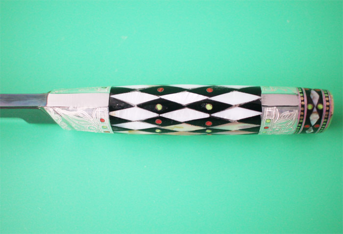 此刀为当代新疆英吉沙小刀名匠 阿不都拉打制,阿不都拉的维文名字,刀把为纯白银镶嵌贝壳,工艺精美,刀刃为黑钢淬火,坚硬且有韧性,全长27厘米,是近年来阿不都拉刀匠很少的代表作之一,配图上的工艺牛皮刀鞘,刀身全龙骨一体,欲购从速。