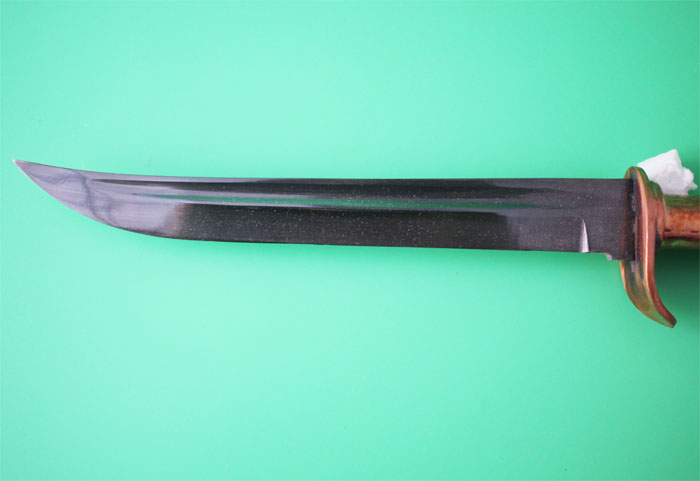 英吉沙小刀,黄铜柄刀把,天然鹿角刀把,因此每把刀刀把各不相同,黑钢刀刃,刀身总长32厘米左右,刀柄处为黄铜,结实,刀刃为钢和铁纯手工打制属于夹钢工艺,并且有铭文 英吉沙 ,坚硬且韧性好,此刀仅有1把样品,欲购从速,大师傅买合木提江打制