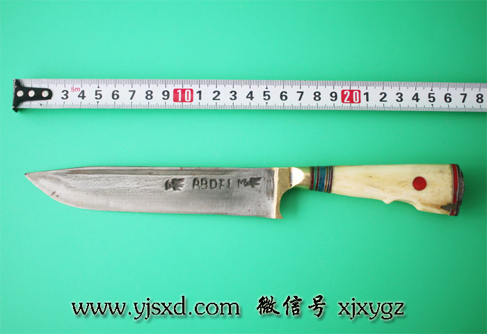 80年代黑钢英吉沙老刀,全长27cm,刀刃镶有 著名刀匠 “阿不都拉”的铭文 ,刀刃坚硬有韧性且锋利,刀柄镶嵌当时流行的有机玻璃进行装饰,刀把为骆驼骨(骆驼骨有开裂,但没全部裂开,购此刀者请看清),仅此一把,购此刀者不支持淘宝支付,只支持款到发货,配牛皮刀鞘,330元包邮。