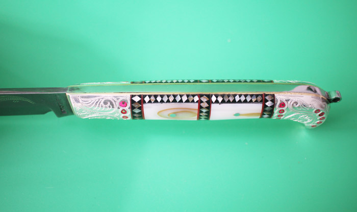 手工英吉沙巴达木花大折刀,全长23cm,合起来全长12cm,刀把为白银制作,刀刃为黑钢手工打制,刀刃上有大师傅名字拉孜的铭文,刀刃为黑钢锻打,并手工镶嵌有精美的铜巴达木花纹,坚硬且有韧性,(此刀刃上镶嵌铜巴达木花纹的工艺现在很少见,因为需要热处理,且费工,大家可以在网上了解一下),配图上牛皮刀鞘,锋利可刮胡子,刀把为白银镶嵌贝壳制作,做工精细,此刀算是折刀里较大的,芒辛乡十社名匠“拉孜”打制,此刀平时有钱也很难买到,因为打制一把折刀所耗费的工比一把直刀要多,但卖价不如直刀高,因此很少再手工打折刀了,本人偶然进得1把,配图上工艺牛皮刀鞘,不打折,议价者请绕行。
