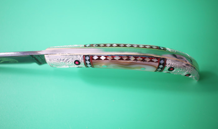 手工英吉沙巴达木花大折刀,全长18m,合起来全长9.5cm,刀把为白银制作,刀刃为黑钢手工打制,刀刃上有大师傅名字拉孜的铭文,刀刃为黑钢锻打,并手工镶嵌有精美的铜巴达木花纹,坚硬且有韧性,(此刀刃上镶嵌铜巴达木花纹的工艺现在很少见,因为需要热处理,且费工,大家可以在网上了解一下),配图上牛皮刀鞘,锋利可刮胡子,刀把为白银镶嵌贝壳制作,做工精细,此刀算是折刀里较大的,芒辛乡十社名匠“拉孜”打制,此刀平时有钱也很难买到,因为打制一把折刀所耗费的工比一把直刀要多,但卖价不如直刀高,因此很少再手工打折刀了,配图上工艺牛皮刀鞘,不打折,议价者请绕行。