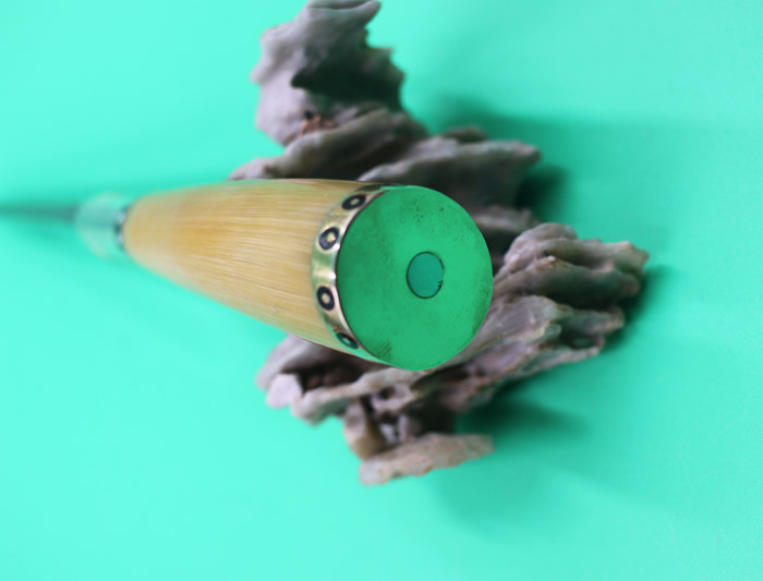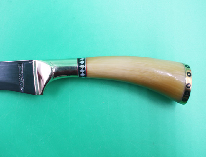 精品黄牛角把英吉沙小刀,全长20公分,反弧形黑钢刀刃,买买提江打制,刀柄和刀尾处均为黄铜,携带方便,做工精致,配牛皮刀鞘.