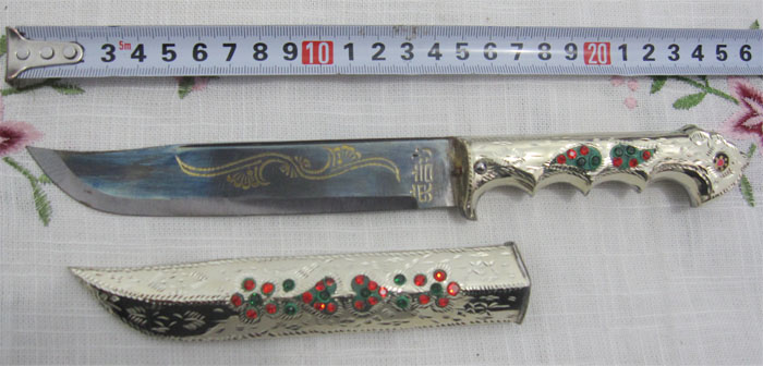英吉沙小刀手工白铜鞘轴承钢刀,纯手工打制,刀把刀鞘均为白铜制作,不生锈,轴承钢手工刀刃,黄铜铸刀把,全长25厘米,配原装白铜刀鞘,配木制刀盒需另加30元钱,更多商品在 www.yjsxd.com www.xjlygw.cn