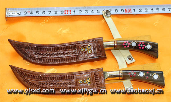 英吉沙黑钢小刀,长23厘米在右,刀刃为黑钢手工打制,刀把为牛角镶嵌贝壳,配牛皮刀鞘,刀把黑的为黑山羊角,大师傅打制,买买提打制,买此一对刀,免费送刀鞘