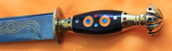 80年代黑钢英吉沙老刀,品相完好,刀把为黄铜铸成,镶嵌当时流行的有机玻璃进行装饰,仅此一把,购此刀者不支持淘宝支付,只支持款到发货。